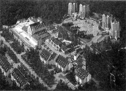 ヤマハの1987年のマスタープラン 。 ホテルピアノの後方に描かれた高層の建物群が目を引く。マウスオーバーで実際に完成した部分を表示。