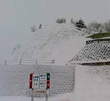 右の写真はシーズン中の朝日山第1ロマンスリフト終点。ここは、スキー場の端で、手前の壁は、冬季閉鎖中の志賀草津道路の法面。スキーに来た時に携帯で撮った写真なので画質が悪いです(おまけに天気も悪い)。