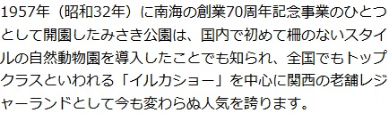 南海線みさき公園駅前の「みさき公園」は、大阪湾を望む広大な丘陵地(290.565u)に広がる動物園・遊園地・水族館(イルカショー)・大型プールなどの施設がある南海直営の総合レジャーランド。