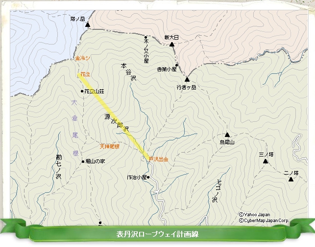 表丹沢ロープウェイ(仮称)は小田急電鉄によって計画された索道で、小田急線渋沢駅から出ている大倉行きバスの終点のさらに先にある「戸沢出会」の山麓駅から、大倉尾根の花立(標高:1370m)の山頂駅までの水平長1227mを70人乗り大型搬器で結ぶというもの。