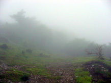 下の写真は駐車場から見た花立方面。この日は朝から小雨が降っていて、花立はガスで隠れています。戸沢出会は、駐車場から坂を上ったところにある少し開けた場所で、山小屋と臨時派出所があります。