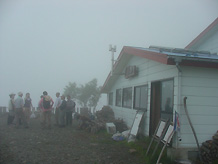 尾根一帯には濃いガスが発生していましたが、山荘前の広場では多くの登山者がお昼を食べたり休憩したりしていて賑わっていました。山荘の方に尋ねてみると、当時、予定地の花立には「ロープウェイ建設予定地」という看板が立っていたとのことです。
